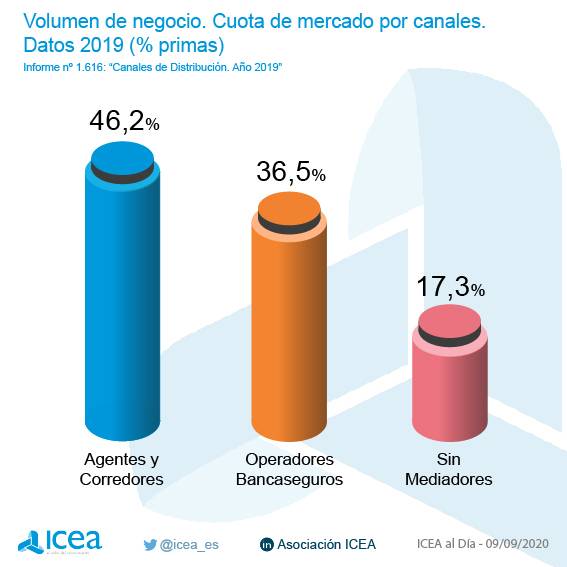 Los operadores de bancaseguros acapararon el 65% del negocio de Vida, aunque ICEA precisa que en los últimos años adquieren mayor relevancia los agentes y corredores en la comercialización de este negocio. En cuanto a No Vida, en comparación con 2010, "se aprecia un crecimiento en la cuota de mercado de agentes y corredores, aunque se viene observando un descenso de este canal desde el año 2000".