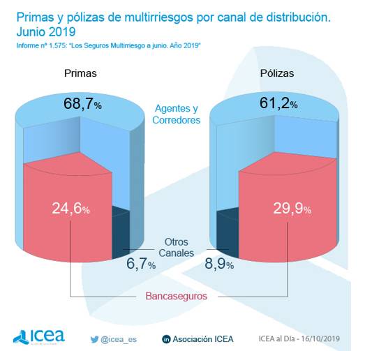 El ramo de Multirriesgo, tercero del sector con el 20,4% del total de primas, está comandado por agentes y corredores. Este canal distribuye el 68,7% de las primas totales, frente al 24,7% de la banca y algo menos del 7% a través de otros.