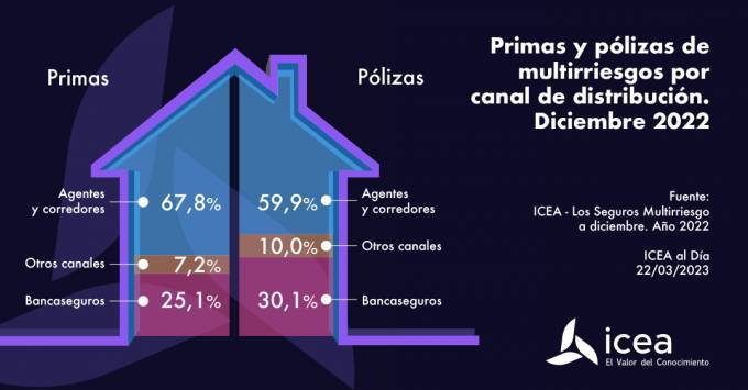 Con datos de ICEA a diciembre de 2022, el 67,8% de las primas y el 59,9% de las pólizas de Multirriesgos fueron distribuidas por agentes y corredores de seguros. Supone batir de forma clara a la bancaseguros, que se quedó en el 25,1% de las primas y el 30,1% de las pólizas.