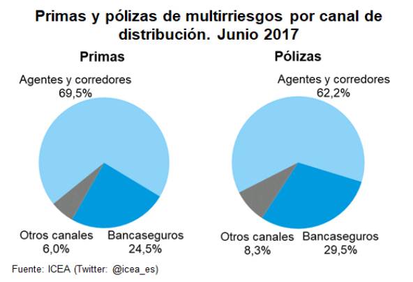 Los datos de ICEA lo dejan claro: la llamada mediación tradicional, agentes y corredores, distribuyen el 69,5% de las primas del ramo de Multirriesgo a junio de 2017. El canal bancario emite el 24,5% y el resto de distribuidores el 6%.