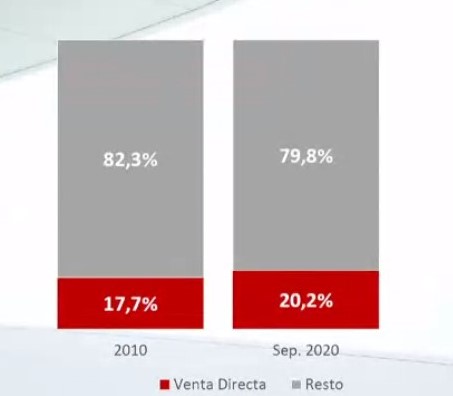 La venta directa parece ser la principal amenaza para la mediación tradicional. Crece, pero muy poco. En 10 años, sólo ha aumentado 2,5 puntos y, en septiembre de 2020, acaparaba el 20,2% del negocio de Autos. Es cierto que está creciendo más que los agentes, pero la mitad que el conjunto de la mediación tradicional. "La venta directa está teniendo menos impacto de lo previsto", reconoció José Manuel Inchausti.