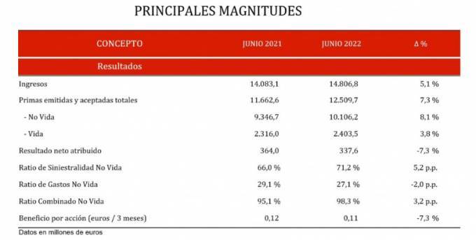 La entidad ya adelantó sus datos de primas que han crecido en un 7,3% hasta los 12.510 millones de euros con un alto crecimiento en No Vida (+8,1%) gracias a la mejora de Autos y Seguros Generales. Asegura el grupo que "se trata del mayor volumen semestral en primas de los últimos cinco años a pesar del contexto económico del periodo". Por su parte, los ingresos en este primer semestre se han elevado hasta los 14.807 millones, un aumento del 5,1% en relación al pasado ejercicio.