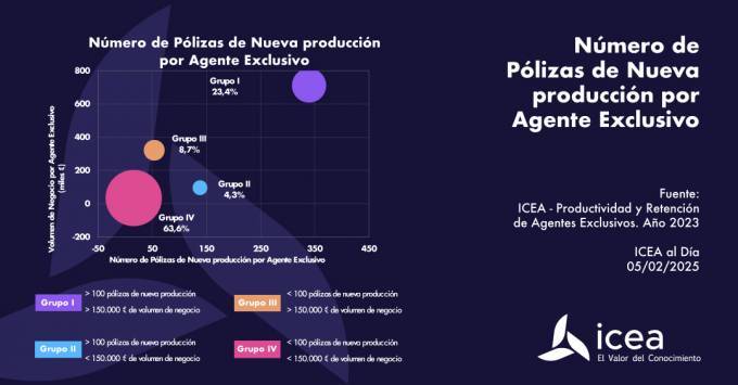 El análisis del negocio en manos de los agentes exclusivos muestra que, en 2023, aquellos que gestionaban más de 100 pólizas de nueva producción y más de 150.000 euros de volumen de negocio al año suponían el 23,4% de los agentes exclusivos, acaparando el 81,7% de las primas de nueva producción. Los datos pertenecen a un nuevo informe de ICEA que recoge que "el conjunto de agentes exclusivos productivos gestiona en promedio 164 pólizas y 138.625 euros de primas de nueva producción al año. Los agentes más productivos, según el criterio anterior, por su parte, gestionan 339 pólizas de nueva producción y 711.969 euros de primas de volumen de negocio al año".
