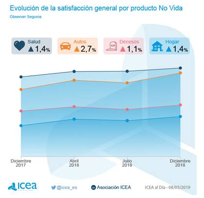 El Barómetro de Experiencia del Cliente que desarrolla ICEA indica que la satisfacción de los clientes de Autos aumentó un 2,7% el pasado año y es el negocio que experimenta un mayor crecimiento. Hogar ySalud están empatados con un 1,4% mientras que Decesos lo hizo un 1,1%. Los clientes de Salud, por otro lado, son los que valoran mejor la atención recibida.