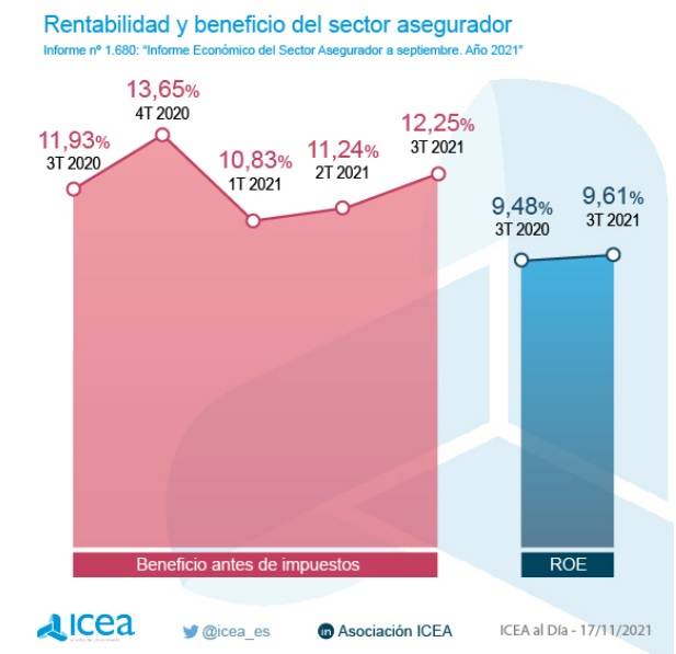 En el tercer trimestre de 2021, el beneficio antes de impuestos sobre primas imputadas se situó en el 12,25%, 0,32 p.p. más respecto al mismo periodo del año anterior, según datos de ICEA.