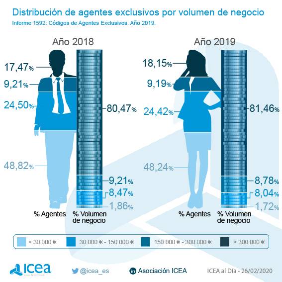 Pero no todas las noticias son negativas. Poco a poco, los agentes exclusivos están incrementando su cartera. De los 53.739 operativos en 2019, 9.753 tenían un volumen de negocio superior a 300.000 euros. Representan el 18,15% del total, casi medio punto porcentual más (0,68) que en 2018 y dos puntos por encima respecto a 2017. Este colectivo aporta al sector el 81,46% de las primas de negocio y aproximadamente 1 millón de euros por agente.