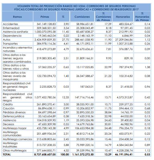 Los corredores de seguros y reaseguros produjeron el pasado ejercicio 8.737 millones de euros en primas No Vida, obteniendo 1.162 millones de euros en comisiones. Supone que obtuvieron el 13,3% de comisiones sobre primas. Los honorarios percibidos fueron de 46,19 millones de euros, lo que equivale al 0,53% sobre primas. Los datos los publicó la DGSFP en el Informe Estadístico Anual de Mediación 2018 (con cifras de 2017).