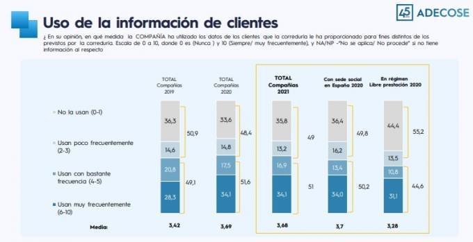 De este 51% que no se fía de las compañías en este aspecto, un 34,1% -igual que en 2020- afirma que en su opinión las aseguradoras usan "con mucha frecuencia" esta información de los asegurados para una finalidad diferente a aquella para la que se la aportaron. Y un 16,9% cree que la utilizan con "bastante frecuencia" para conseguir otro objetivo del fijado previamente, usándola en su propio beneficio y perjudicando al corredor.