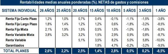 Este hecho también ha provocado que las rentabilidades en el medio-largo plazo incrementaran su tendencia positiva. Por ejemplo, a 26 años, los Planes de Pensiones registran una rentabilidad media anual (neta de gastos) del 2,6% y, en el medio plazo (10 y 15 años), presentan una rentabilidad del 2,8% y 1,4%, respectivamente.