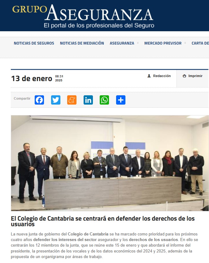 En segunda posición se coloca la noticia 'El Colegio de Cantabria se centrará en defender los derechos de los usuarios', publicada el 13 de enero, que resalta el objetivo de la institución de comenzar una nueva etapa centrada en fortalecer el sector de la mediación de seguros "con una entidad colegial que proteja los intereses de los profesionales y los derechos de los usuarios basándose en la máxima de que 'la unión hace la fuerza', por lo que anima a todos los mediadores cántabros a colegiarse y a participar en las acciones de la entidad para situar el colectivo en el lugar que merece", tal y como explicaron en un comunicado emitido en su momento.