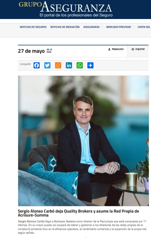 El Top 3 lo cierra el anuncio de Sergio Alonso de incorporarse a Acrisure-Suma publicado el pasado 27 de mayo. Noticia titulada 'Sergio Alonso Carbó deja Quality Brokers y asume la Red Propia de Acrisure-Summa'.