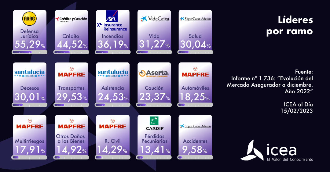 Los líderes de los 6 ramos restantes son: ARAG, que domina Defensa Jurídica (55,29%); Crédito y Caución, que está al frente de Crédito (44,52%); AXA XL, a la cabeza de Incendios (36,19%); VidaCaixa, en Vida (31,27%); Aserta, que lidera Caución (23,37%); y Cardif, que está en lo más alto de Pérdidas Pecuniarias (13,41%).