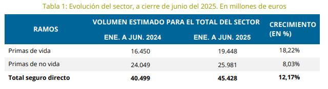 Al cierre del primer semestre de 2025, los ingresos por primas de las aseguradoras se han elevado hasta los 45.428 millones de euros, lo que significa un 12,17% más que en el mismo periodo del año anterior, según los datos provisionales recabados por ICEA y difundidos por Unespa. De esta manera, la recaudación del sector intensifica su crecimiento ya que, en los tres primeros meses del año, el volumen de primas del seguro aumentó un 6,8%. Hasta junio, el sector ha recaudado casi 5.000 millones más que 12 meses atrás.