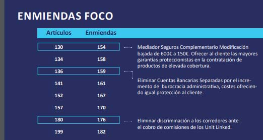 En el informe mencionado, 'Informe Defensa enmiendas a la IDD ante los grupos políticos. Defensa, exposición y negociación', Fecor explica paso a paso las 8 enmiendas que ha presentado. Todas ellas tienen relación con artículos del Título I. Destacó la federación que conforme se producían reuniones con los políticos quiso centrarse en 3 enmiendas que considera foco y, aunque promueve todas, son para ellos las más significativas.