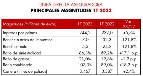 Al cierre del primer trimestre de 2023, Línea Directa ha registrado una pérdida neta de 5,3 millones de euros al sufrir el impacto de la inflación en los costes y el repunte de la frecuencia siniestral. De esta manera, la aseguradora pasa de ganar 24,2 millones en los tres primeros meses de 2022 a perder más de 5 millones un año después, experimentando así un decrecimiento del 121,8%.