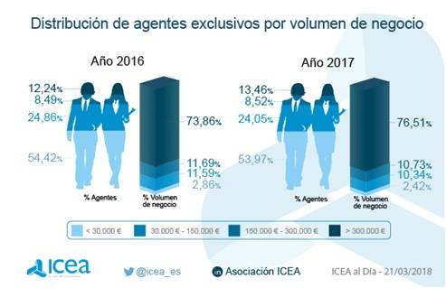 ICEA ha analizado el peso que tiene el volumen de negocio que gestionan los agentes exclusivos y observa que un 13% del conjunto de agentes exclusivos -cuya actividad supera los 300.000 euros- acaparan el 76,51% de las primas de negocio.