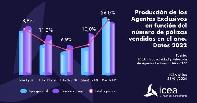 Y si no se hace distinción por tipología, de ese 73% de agentes exclusivos que al menos distribuyeron una póliza, un 26% fueron más allá e intermediaron más de 109.