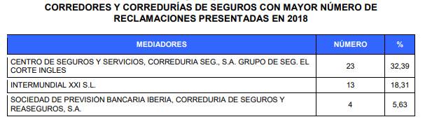 La correduría de El Corte Inglés, Intermundial y la Sociedad de Previsión Bancaria Iberia son las 3 corredurías que sumaron el mayor número de reclamaciones a la mediación el pasado año y entre ellas acapararon el 56,3% del total, según los datos de la Memoria del Servicio de Reclamaciones de la DGSFP. La mediación (corredores y corredurías) recibió un total de 71 reclamaciones, un 12,35% menos que un año antes.