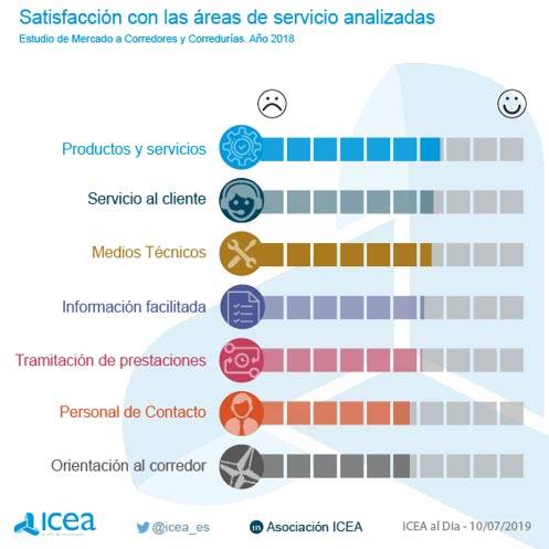 Por detrás en cuanto a satisfacción se encuentran el servicio al cliente y los medios técnicos. El elemento peor valorado por los profesionales de la distribución es la orientación al corredor y el personal de contacto.