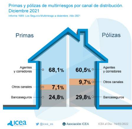 Los datos de ICEA indican que agentes y corredores han comercializado el 68,1% de las primas de Multirriesgos frente al 24,8% que ha correspondido al canal bancaseguros; el restante 7% son suscritos por otros canales.