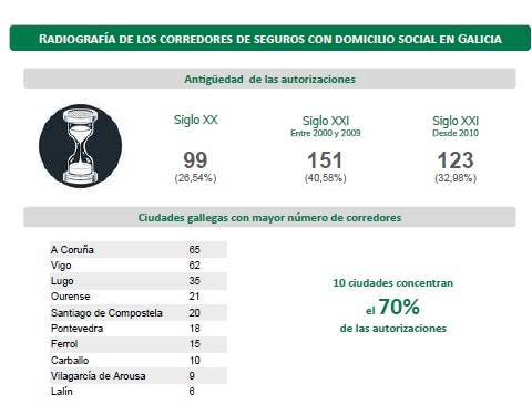 Las corredurías gallegas suponen el 7,38% del mercado español y se concentran principalmente en las 7 grandes ciudades gallegas. Destaca que en su ámbito de operaciones, el 72% tiene autorización para operar en el conjunto del Estado.