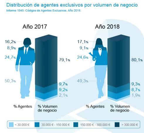 Si analizamos los datos con la variante primas y número de agentes encontramos que el 80% del total de las primas lo comercializan el 17,1% de los agentes. A su vez, este mismo porcentaje cuenta con una cartera superior a los 300.000 euros de primas. Este índice de primas y agentes es ligeramente superior a los datos de diciembre de 2017. De esta manera, estaríamos hablando de un pequeño crecimiento en la concentración del mercado por parte de los agentes.