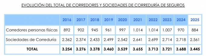 Por su parte, las corredurías también han visto reducir su número, pero en menor medida. Se redujeron entre 2023 y 2025 un 5,6% hasta alcanzar las 2.561 corredurías en noviembre del pasado año. Todos estos datos proceden del Informe estadístico anual de la mediación publicado recientemente por la DGSFP y donde también se incluye información sobre el negocio de la distribución de seguros.