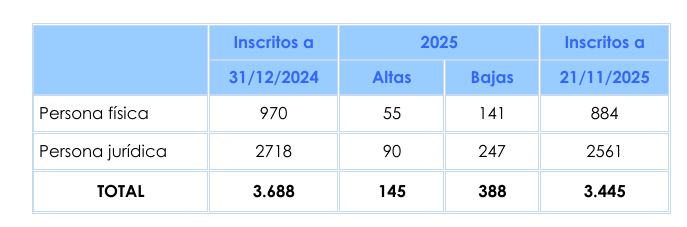3.445, una cifra un 6,5% inferior a la de un año antes. Los corredores personas jurídicas han pasado de 2.716 a los actuales 2.559, lo que muestra un retroceso del 5,7%.