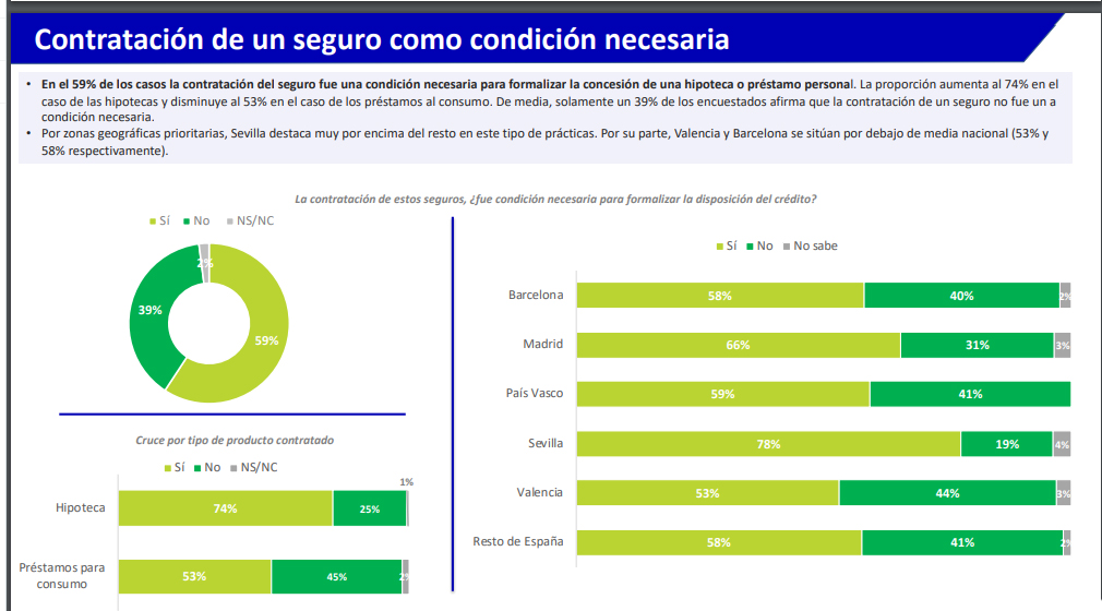 Otro de los datos que deja la encuesta es que el 59% de los encuestados afirma que la contratación de un seguro fue una "condición necesaria" para la concesión de la operación financiera que asciende al 74% en el caso de una hipoteca y al 53% para un préstamo. Por el contrario, el 39% señala que no se le exigió la contratación de un seguro para la concesión del dinero.