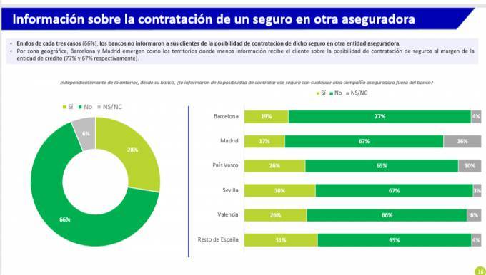 Otro dato de la consulta es que el 66% de los encuestados -2 de cada 3- asevera que el banco no le informó de que podía contratar el seguro en otra entidad. Por zonas geográficas, Barcelona y Madrid son los territorios donde menos información recibe el cliente sobre esta opción.