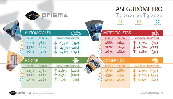 Y en lo que se refiere al seguro de Comercios, la prima media en el tercer trimestre fue de 483 euros, frente a los 488 euros correspondientes al mismo periodo del 2020, lo que significa una disminución del 1% (5 euros menos por póliza) En nuevas contrataciones la prima media fue de 439 euros cuando en ese mismo trimestre del pasado año era de 473 euros, por lo que la disminución del precio fue del 7,2% (34 euros menos por póliza).