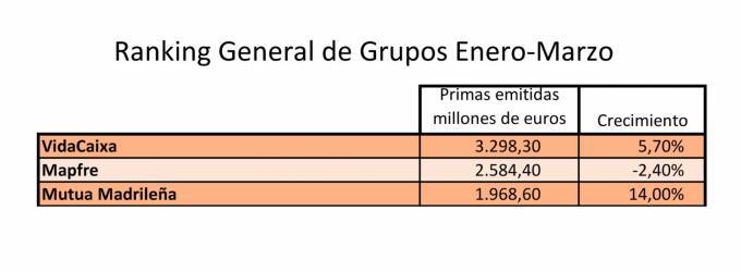 El sector asegurador presentó ayer los resultados del primer trimestre, en el que registró una caída del 3% en su volumen de primas y una aportación mejor de No Vida que la del negocio de Vida. Esto también se nota en el ranking de grupos que te traemos hoy. Por arriba, VidaCaixa (+5,7%), Mapfre (-2,4%) y Mutua Madrileña (+14%) permanecen como líderes del seguro. En el Top 10, hay 4 grupos que apenas se distancian en 30 millones de euros en primas. Y, entre otros movimientos, se registra un cambio histórico en Autos.