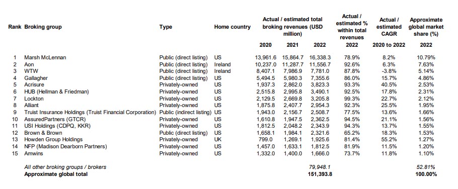 Los 3 principales corredores a nivel mundial por ingresos por comisiones son Marsh McLennan, Aon y WTW. Entre estos 3 brokers acaparan una cuarta parte de los ingresos totales de los corredores hasta un total de 35.676 millones de dólares, un 23,5% sobre el total.