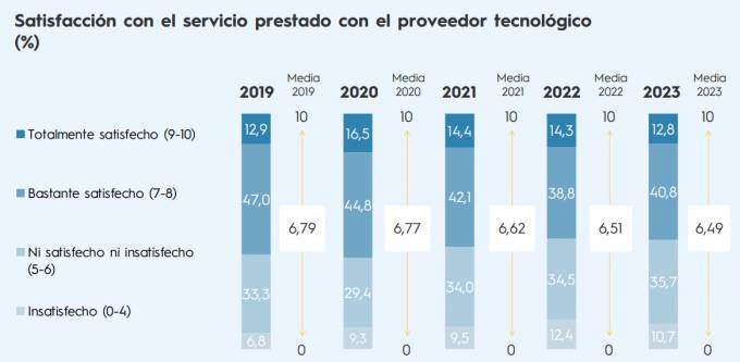 Lo positivo para las tecnológicas es que se reduce en casi 2 puntos el porcentaje de encuestados que otorgan un suspenso al afirmar que se sienten "insatisfechos". En esta última edición, se queda en un 10,7%. Si bien todavía queda lejos el 6,8% de 2019.