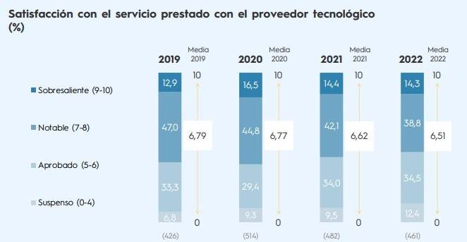 En 2022, la nota media con la que las corredurías de Adecose han calificado la calidad del servicio de las tecnológicas es de 6,51 puntos (sobre 10), por lo que se reduce por tercer año consecutivo. En 2019, se elevó hasta el 6,79 pero, a partir de ahí, ha ido bajando: 6,77 puntos en 2020; 6,62, en 2021; y el año pasado ese 6,51 ya reseñado anteriormente.