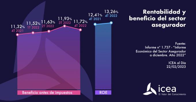Según datos facilitados por ICEA de su 'Informe económico del sector asegurador. Estadística a diciembre. Año 2022', el seguro español logró incrementar el beneficio antes de impuestos sobre primas imputadas al cierre del cuarto trimestre, situándose en el 11,72%, lo que significa 0,40 puntos más respecto al mismo periodo del año anterior. Se trata de una ligera subida pero es importante porque rompe la tendencia bajista del ejercicio anterior, cuando se quedó en el 11,32% después de reducirse 2,31 puntos.