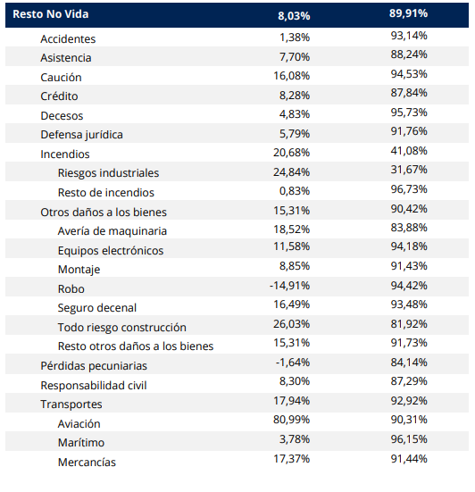Y, en cuanto al resto de No Vida, su evolución también es mayúscula con un crecimiento del 8,03%, elevando su recaudación hasta los 5.766 millones. Dentro de este bloque, los mayores crecimientos han sido para: Todo Riesgo Construcción (+26%), Incendios (+20,6%), Avería de maquinaria (+18,5%), Transportes (+17,9%), Seguro Decenal (+16,49%) y Caución (+16%).
