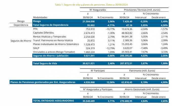 Esta cifra se ve mejorada tanto por los seguros de Vida -aunque cuenta con una ligera caída de Vida Riesgo- como por la parte de Planes de Pensiones que gestionan las entidades aseguradoras. En total, entre asegurados y partícipes, el seguro da servicio a 35,5 millones, un 3,7% más que en junio de 2023.