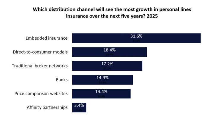 La encuesta señala, entre otros aspectos, que el 31,6% de los encuestados indica que estos seguros son el canal con mayor potencial de crecimiento en la distribución. Apunta la entidad que el número de participantes que apuestan por este canal es "significativamente mayor que la de los modelos directos al consumidor (18,4%) o las redes de corretaje tradicionales (17,2%), las otras opciones más destacadas".