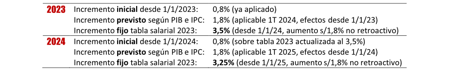 Según precisa UGT, "la tabla salarial definitiva del año 2023 se incrementará un 3,5% sobre la tabla salarial definitiva de 2022", pero "a los solos efectos de ser el punto de partida para el pago de los salarios desde el 1 de enero de 2024". Esto quiere decir que "solo se abonará retroactivamente, con efecto a 1 de enero de 2023, el importe resultante de aplicar la fórmula de incremento salarial para el año 2023 prevista en el artículo 44 del convenio, descontado el incremento salarial inicial del 0,8% recogido en la tabla salarial inicial aprobada de 2023". Y la misma fórmula se ha pactado para fijar "la tabla salarial definitiva del año 2024", aunque el incremento será del 3,25%, 0,25 puntos menos que en el presente ejercicio.