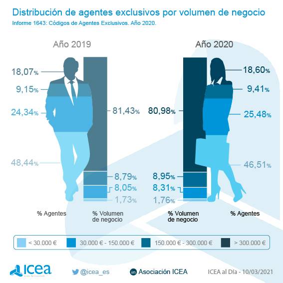 Y de nuevo descendió el número de agentes exclusivos con volúmenes de negocio más bajos. Al término de 2020 eran 12.869 profesionales los que contaban con una cartera de entre 30.000 y 150.000 euros, el 25,82% del conjunto de agentes exclusivos, mientras la cifra de aquellos con una cartera inferior a 30.000 euros fue de 23.587, el 46,51% del total.