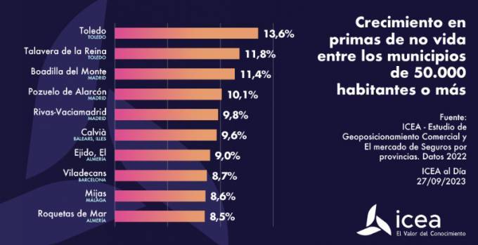 La ciudad de Toledo y Talavera de la Reina en la provincia de Toledo, y Boadilla del Monte y Pozuelo de Alarcón, en Madrid, son los tres municipios mayores de 50.000 habitantes que más crecieron en primas No Vida durante el pasado año. Los datos de ICEA en su informe 'El Mercado de Seguros por Provincias. Estadística año 2022' les atribuye avances superiores al 10%. Por encima de todas ellas se encuentra Toledo que creció un 13,6%.