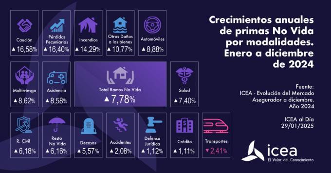 Como ya contamos en Carta del Seguro, No Vida logró 46.333 millones de euros en 2024, con un avance del 7,78%. Y todas sus principales líneas de negocio cerraron el año en positivo: Autos (+8,88%), Multirriesgos (+8,62%) y Salud (+7,4%).