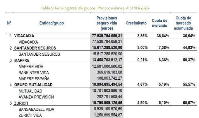 VidaCaixa sigue siendo la primera aseguradora de Vida del mercado con una cuota de mercado del 36,64% e imposible de alcanzar por sus competidores. Sus provisiones superan los 77.539 millones de euros con un crecimiento en el trimestre del 3,35%, según el ranking publicado por Unespa.